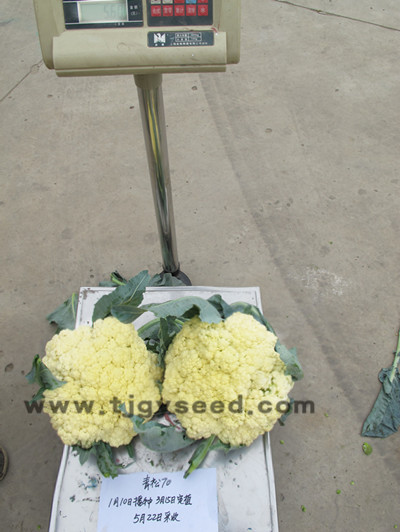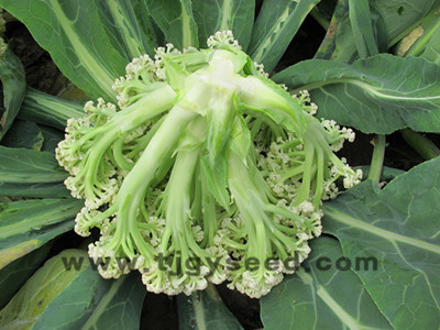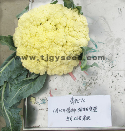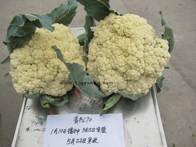 品种特性:最新育成的中早熟松花菜新品种,秋季种植,定植后70天左右开始收采收。花球松大、平整、品质好,产量高,单球重2.5公斤左右。植株长势旺盛,抗逆性好,花球形成期适宜气温为日平均温度24-18℃。