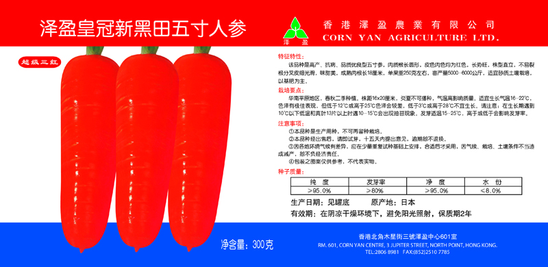 该品种是高产、抗病、品质优良性五寸参,肉质根长圆形,皮色肉色均为红色,长势旺,株型直立,不易裂根分叉皮细光滑,味甜美,成熟肉跟长18厘米,单果重250克左右,亩产量5000-6000公斤,适宜砂质土壤栽培,以基肥为主。