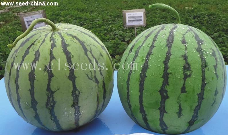 本品种系中熟偏早品种,全生育期88-90天,果实成熟期29天左右。植株生长势中等,分枝力强,主蔓第一雌花着生节位7-8节,雌花间隔4-5节。坐果性好,果实高圆形,单瓜重5-6kg,果皮绿色,上覆深绿色虎纹条带,果肉鲜红,中心可溶性固形物含量12%,品质优。