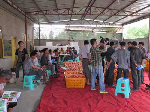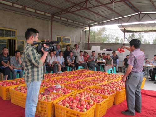 下午两点钟时,烈日炎炎,但是示范田边已经聚集了周边各乡镇、各村庄闻讯赶来的番茄种植户,他们大多骑着摩托车、三轮车从四面八方赶来。荣县电视台对部分农户进行了会前采访,很多农户已经对卡迪亚、迪欧一号和迪欧红冠已经早有耳闻,这次主要是要到现场更多得是关注这些品种的销售政策和专家建议。
