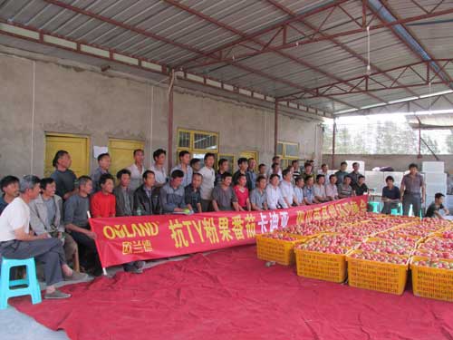 2点30分会议准时开始,由四川省荣县农民创业协会副会长李双怀经理主持,四川省荣县农牧业局副局长罗意先生发表了热情洋溢的讲话,他首先对欧兰德在荣县召开新品种现场推广会表示欢迎和感谢。他说,欧兰德公司的几个番茄品种在当地表现优异,与当地主栽品种形成了巨大的反差,大幅提高了当地农民种植番茄的效益,提高了当地农民发展蔬菜等高附加值经济作物的积极性。对我们荣县的菜农朋来说是一件大好事,他希望欧兰德公司把更多新品种推广到荣县来,同时也会欢迎并大力支持更多新品种观摩会的举办。随后,欧兰德营销中心陈小兵经理,向参会领导和群众汇报了欧兰德公司坚持高端品牌发展战略和公司迅猛发展的现状以及品种的销售政策,并带领现场参会人员一起参观了这三个卡迪亚等3个抗TY高端番茄品种。最后,陈小兵经理同示范种植户、参会人员对品种进行了归纳,大家对欧兰德的几个番茄新品种给予了极高的评价:粉果番茄卡迪亚果个均匀,硬度好,耐运输,果形美观,萼片伸展,坐果量大产量高,综合抗病性一流,是一个精品果番茄的领袖型品种。迪欧一号植株生长健壮,果个大,抗性好,产量高。迪欧红冠果个大且果型美观,萼片伸展,果脐小,是当地最优秀的抗TY大红果西红柿。