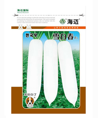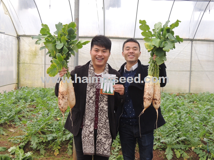 首部白色,根型美观,表面雪白光亮,叶色浓绿,叶片少,叶片平展,根肥大快,抽苔晚。根长约33-36cm,根粗约7cm ,根重约1000-1600g。商品性佳,不易裂根,不易糠心,收获期长。