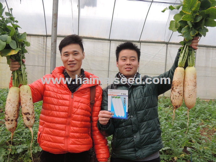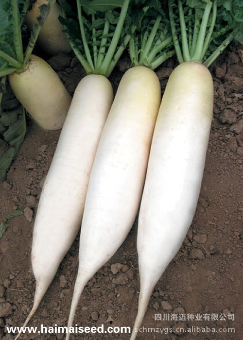 早熟,播种至初收约60天,根长圆筒形,表皮光亮洁白,肉质清甜,口感好,不易糠心。单根重约1300-2000g,根长约38cm,根粗约7cm,极少发生岐根,裂根。叶少叶片平展,根膨大快,不易抽苔,抗性强。