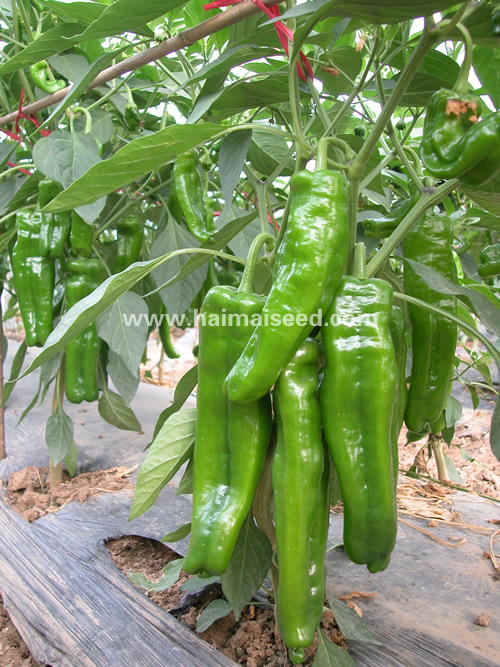 1.早熟,嫩果绿色,基地专用,特大牛角椒,膨长速度快,果长约16-22cm,横径约4-6cm,果重约150-260克,最大可达320克,连续挂果能力强,亩产鲜椒约8000-12000斤。