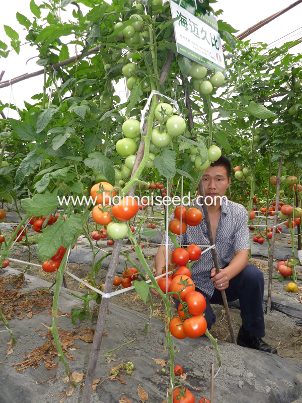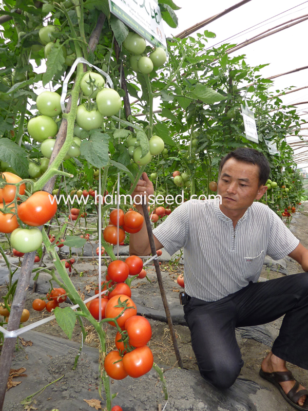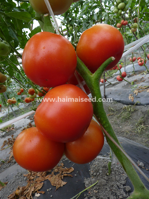 中早熟,无限生长型品种。成熟果红色鲜亮,长势旺盛,连续结果能力强,平均单果重200-250克,果型标准,肚脐特小,不易裂果,果肉厚,特硬,特耐贮运。本品种宜双杆整枝,建议每株留4-8序果,每序留4-6个果左右,果型整齐,商品性特优。抗逆性强。适宜长江流域蕃茄商品基地栽培。