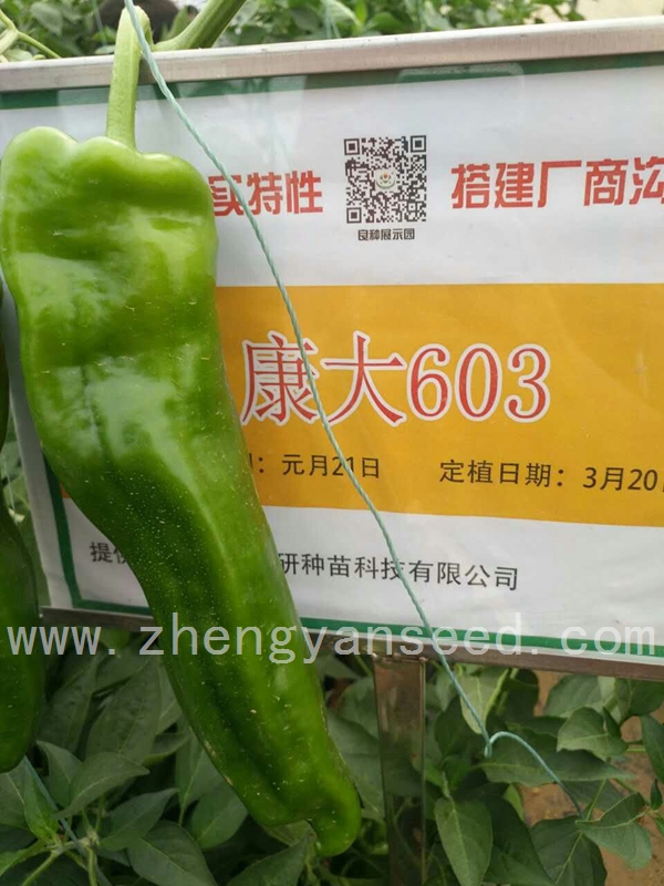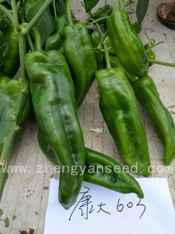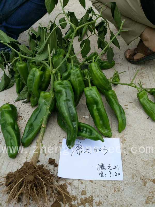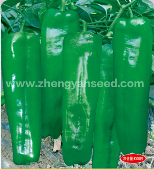 该品种系我公司辣椒育种家最新育成的提早上市首选辣椒新品种。该品种早熟性极好,易坐 果,大果型,果色较绿,果型美观,膨果速度快,前后期果型基本一致;植株长势旺盛,抗病性强,耐低 温能力较强。果实粗牛角形,果长25厘米左右,粗5厘米左右,单果重200克左右,大果可达300克;光泽 度好,果实整齐一致,连续座果能力强。适合全国各地春秋保护地及露地种植。