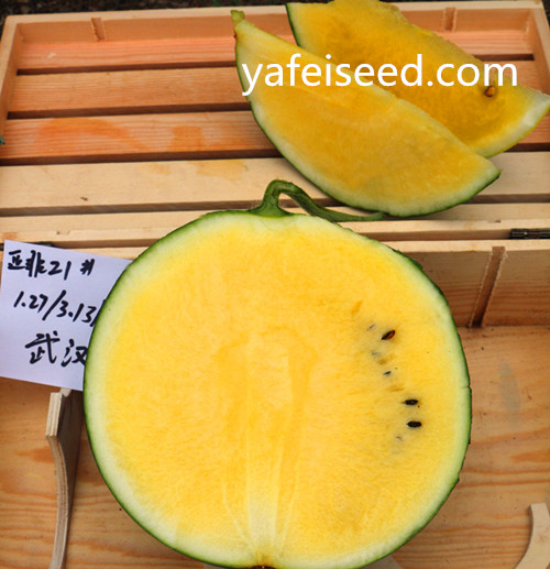 特征特性:日本进口极早熟品种,表皮深绿色黄肉的礼品西瓜。条纹不明显,带有黑色光泽,瓜形高圆,果长20cm左右,单果重2.0kg左右,瓤色鲜黄,耐储运性较好,座果后25天左右成熟。花粉多,座果率良好,裂果也少。商品性好,经济效益有保障。