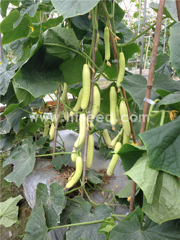 早熟,第一雌花着生于第3-4节,雌花率95%以上,强雌性;以主蔓结瓜为主,春季播种至始收60天左右,结成性强,一株能同时坐2~4条瓜。白色瓜呈淡翡翠绿,有少量浅绿条纹,刺瘤小,稀少,白刺。腰瓜长18-25厘米,粗3.0-4.0厘米,单瓜重150-220克,瓜条顺直,近圆筒形,商品外观好。果实品质好,连续3年多点试验结果表明均无苦味瓜产生,且口感脆嫩、汁多。对霜霉病、白粉病等黄瓜主要叶部病害抗性强。适合长江流域春季栽培,亩产约3000公斤。