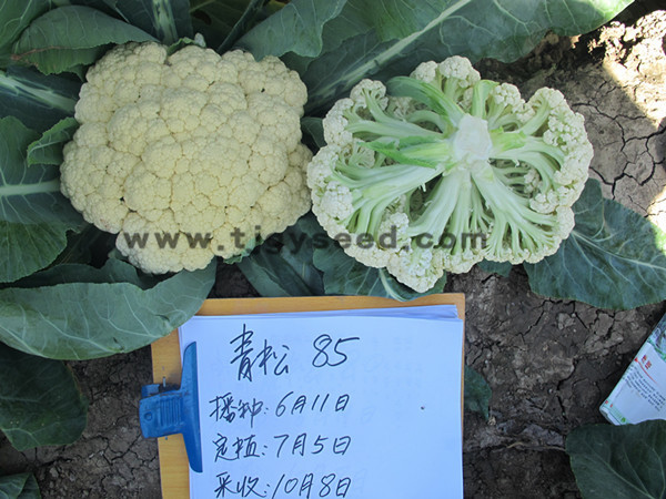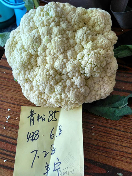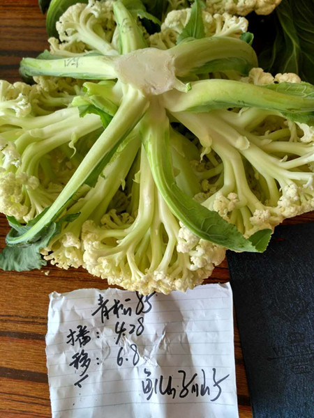 品种特性:春秋兼用松花菜新品种,最新育成,花球松散、花梗青且长,品质好。植株长势旺盛,抗逆性好,花球形成期适宜气温为日平均温度16-21℃。淮河流域及其以南地区可进行秋季种植,秋种定植后85天左右收获,单球重2公斤左右;黄河与海河流域可进行春季种植,春季最低温度达到12℃方可定植,定植后60天左右收获,单球重1.5公斤左右。