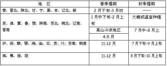 栽培要点:1、合理安排播期:海河流域、黄河流域春季种植 于1月上旬播种,淮河流域及其以南地区秋季种植于7月上旬播种。其他地区根据品种特性和当地气候特点合理安排播种日期。下表仅供参考
