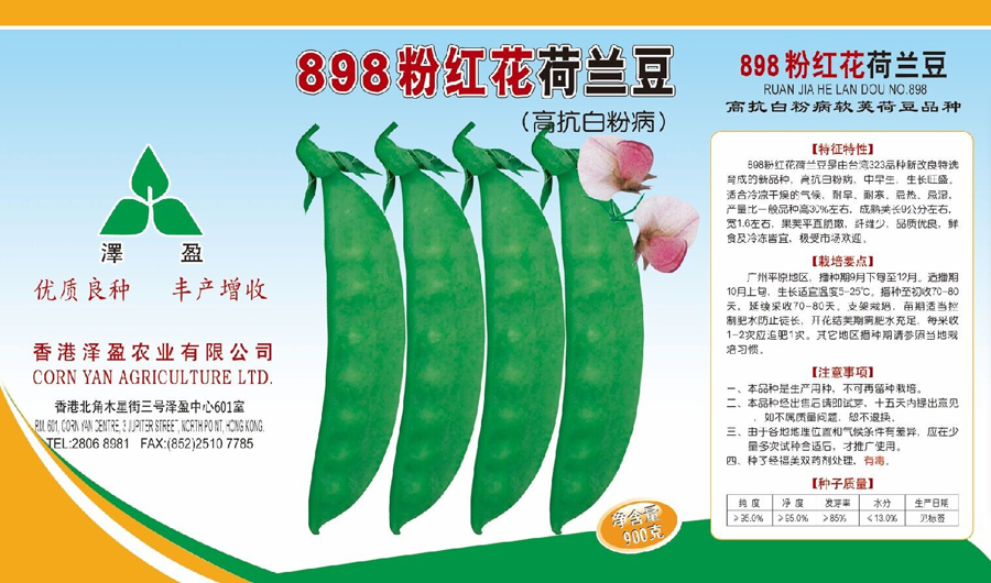999粉红花荷兰豆是由台湾323品种新改良特选育成的新品种,高抗白粉病,中早生,生长旺盛。适合冷凉干燥的气候,耐旱、耐寒、忌热、忌湿、产量比一般品种高30%左右,成熟荚长9公分左右,宽1.6左右,果荚平直脆嫩,纤维少,品质优良,鲜食及冷冻皆宜,极受市场欢迎