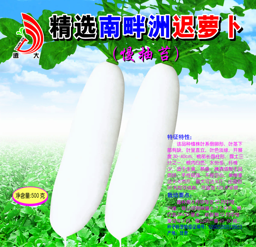 该品种植株叶系倒卵形,叶茎下部有缺,叶呈直立,叶色淡绿,开展度30-40cm,根部长圆柱形,露土三分之一,根肉白色,水份多,纤维少,适于生食、熟食、腌渍或制于品质好,冬性较强,不易空心,单株重达2-6市斤,最大可达9斤,出苗后90天即可成熟,可延至120天采收。