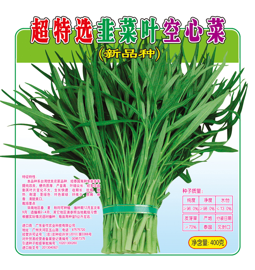 本品种是台湾优良农家品种,经泰国育种专家多年提纯改良。梗肉质厚,产量高,叶细尖长,经多次收割其叶片变化不大。生长快速,收期长,抗病、耐热、耐湿,茎绿色,叶色翠绿,纤维少,稚嫩,味香,清脆爽口。