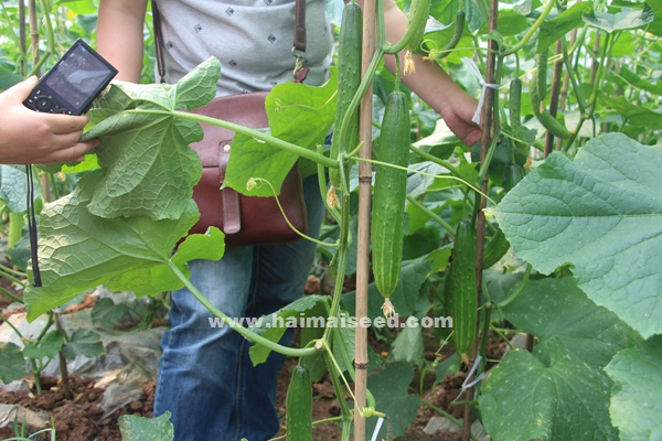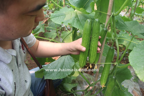 高端黄瓜基地首选品种,强雌,极早熟,无苦味,长势旺,主侧蔓均能结瓜,瓜条顺直,长约22-25cm,果皮嫩绿色,光泽度好,肉瘤少,甜脆可口,不易老化,不易硬皮变色,膨瓜快,播种后45-50天可上市,采收期长,亩产特高,抗性好,适宜性广,是进超市、酒店的最佳品种之一。