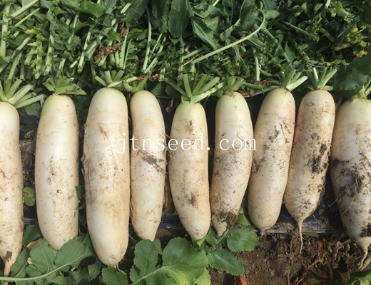 特性: ①适合于早春保护地和高冷地栽培。 ②草姿开展,叶数少,适于密植,抗抽苔,不易糠心。 ③肉质清脆,有甜味,口感好。 ④根皮纯白,很少发生须根及裂根。 ⑤播种后60天采收,单根重1.4-1.6kg,可延期收获。