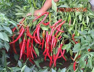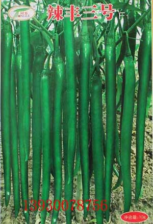 2、辣丰三号:中熟长线椒品种。植株生长势较强,株型好,分枝多,叶片小,叶色浓绿;果实细长、顺直,过长22厘米左右;果宽约1.5厘米,青果深绿色,老熟果红色鲜艳,单果重22克左右,微辣,有香味;坐果性好,综合抗性强。适宜鲜椒上市或酱制加工。