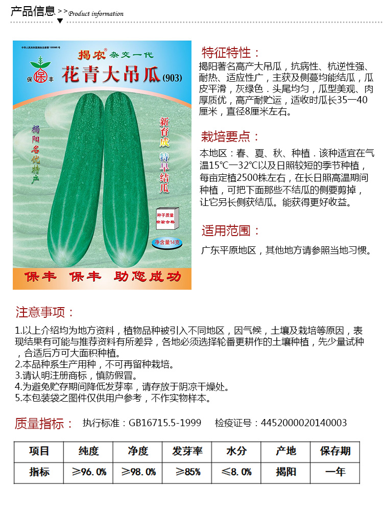 特征特性:揭阳著名高产大吊瓜,抗病性、抗逆性强、耐热、适应性广,主蔓及侧蔓均能结瓜,瓜皮平滑,灰绿色,头尾均匀,瓜型美观、肉厚质优,高产耐贮运,适收时瓜长35-40厘米,直径8厘米左右。