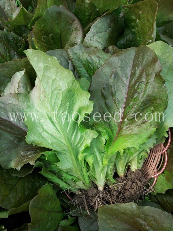 特征特性:意大利引进品种,不结球生菜,株形半直立,株高22厘米左右,开展度20-25厘米,叶大,叶面紫红色,光泽美观质脆,味香,好吃。喜光照品和气候,避免在高温及雨季中种植,生长快,采收期长,产量高,耐抽苔。