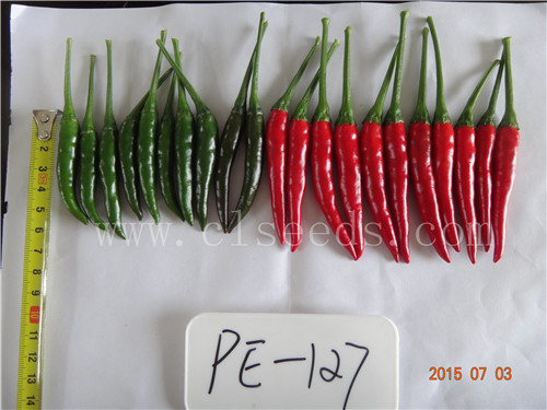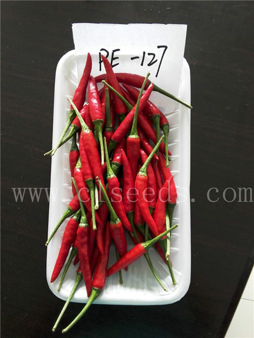中熟单生朝天椒类型,一代杂交,株高100厘米。叶片小,叶色浓绿;果实锥形,果长4-6厘米,果宽1.3厘米,果型生长整齐一致,青果颜色翠绿,红果颜色鲜红亮丽。适应于集中采收,果型优美,辣味强,产量高,商品性好,适应性广,高抗病毒病,容易栽培,干鲜两用型。