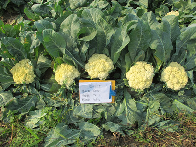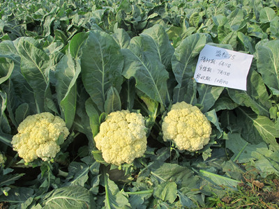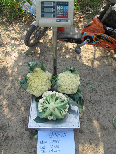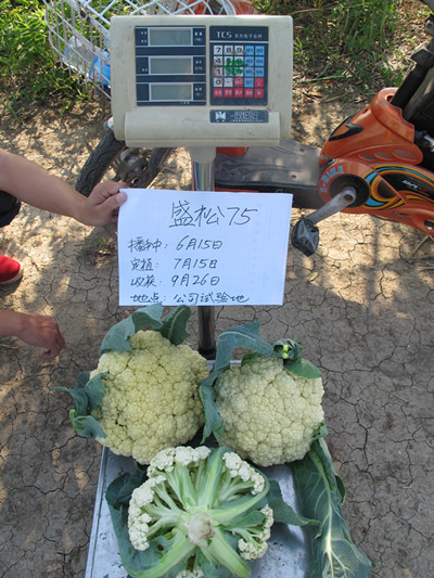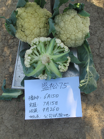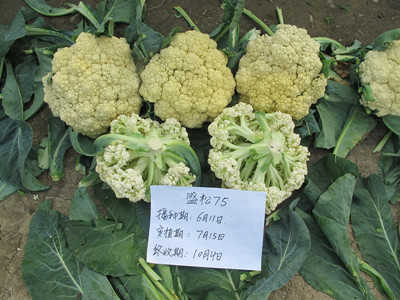 品种特性:最新育成的中早熟松花菜新品种,秋季种植,定植后75天左右开始收采收。花球松大、平整、品质好,产量高,单球重2.0公斤左右。植株长势旺盛,抗逆性好,花球形成期适宜气温为日平均温度24-18℃。