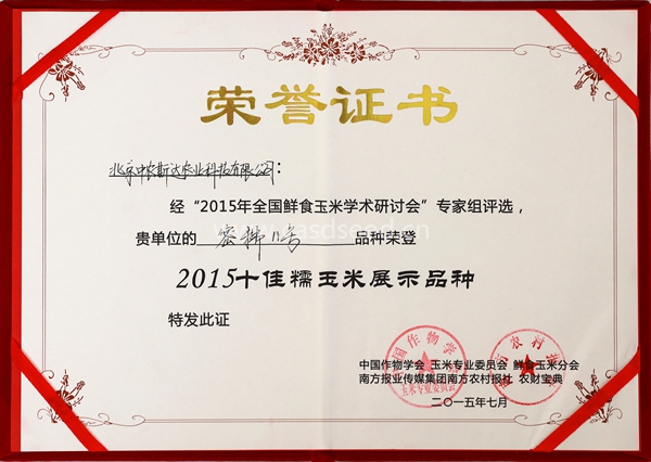 在北京地区从出苗至采收89天,株型半紧凑,叶色淡绿,株高245cm,穗位115cm,花丝绿色;果穗筒型,结实饱满;穗长22cm,穗粗4.6cm,14-16行,子粒排列整齐,行直,白轴。籽粒排列紧密,适宜采收期授粉后24-26天,该品种品质好,植株保绿性好,抗倒伏性突出。