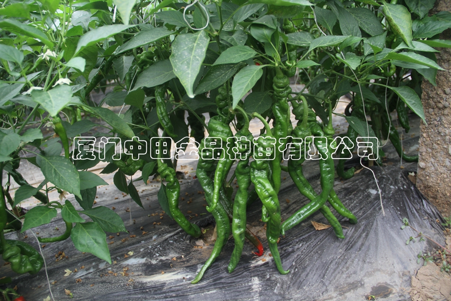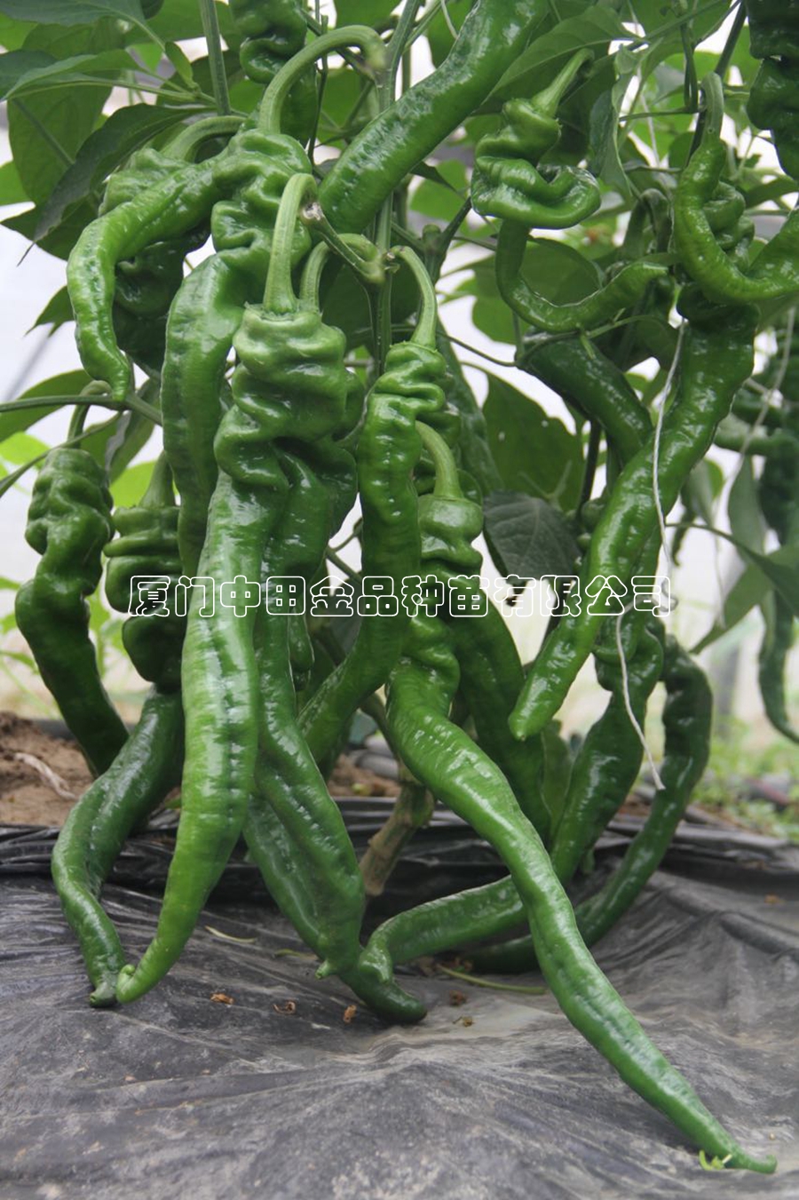 中果螺丝椒,早熟,皮薄质脆,品质佳。生长强健,叶色深绿,耐低温。膨果速度快,连续结果能力强,产量高。果长28-30厘米,果粗3.5厘米左右。果皮浓绿,辣味浓,果肉厚。