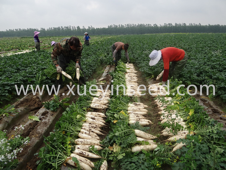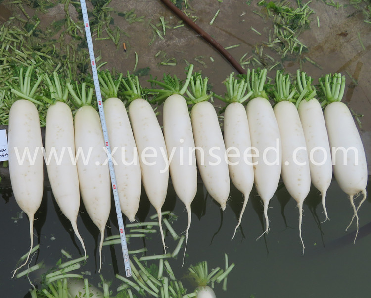 长圆筒形,根皮洁白,有光泽,根眼小,收尾好。花叶,叶色深绿,叶片半开展,耐抽薹性好。播种后60天左右可收获,根长30cm左右,根径7cm左右,应适时采收。根部肥大快,糠心晚,低温采收不易断裂。