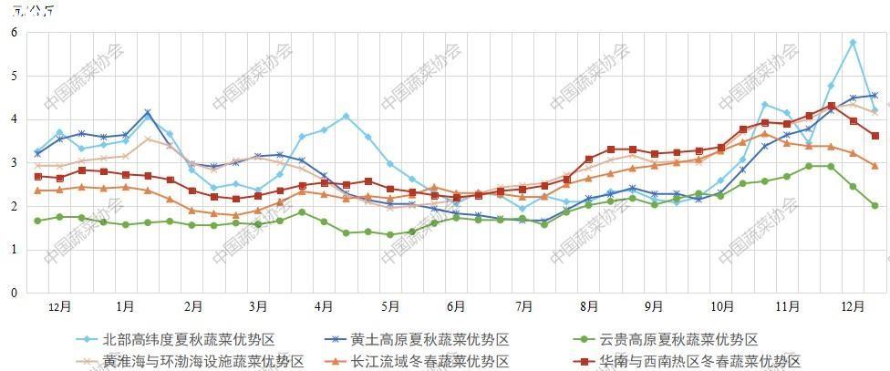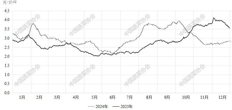三是中下旬暖冬效应带动价格持续回落。12月16日起,全国多地气温显著偏高,利于蔬菜生长与采收,黄淮海设施蔬菜和“南菜北运”蔬菜集中上市,供应形势明显改善,常年出现在10月中下旬至11月份的第二个季节性回落推迟至此才逐步显现,地头价持续下行,月底,日均地头价已降至3.57元/公斤,较12月15日下降10.1%。