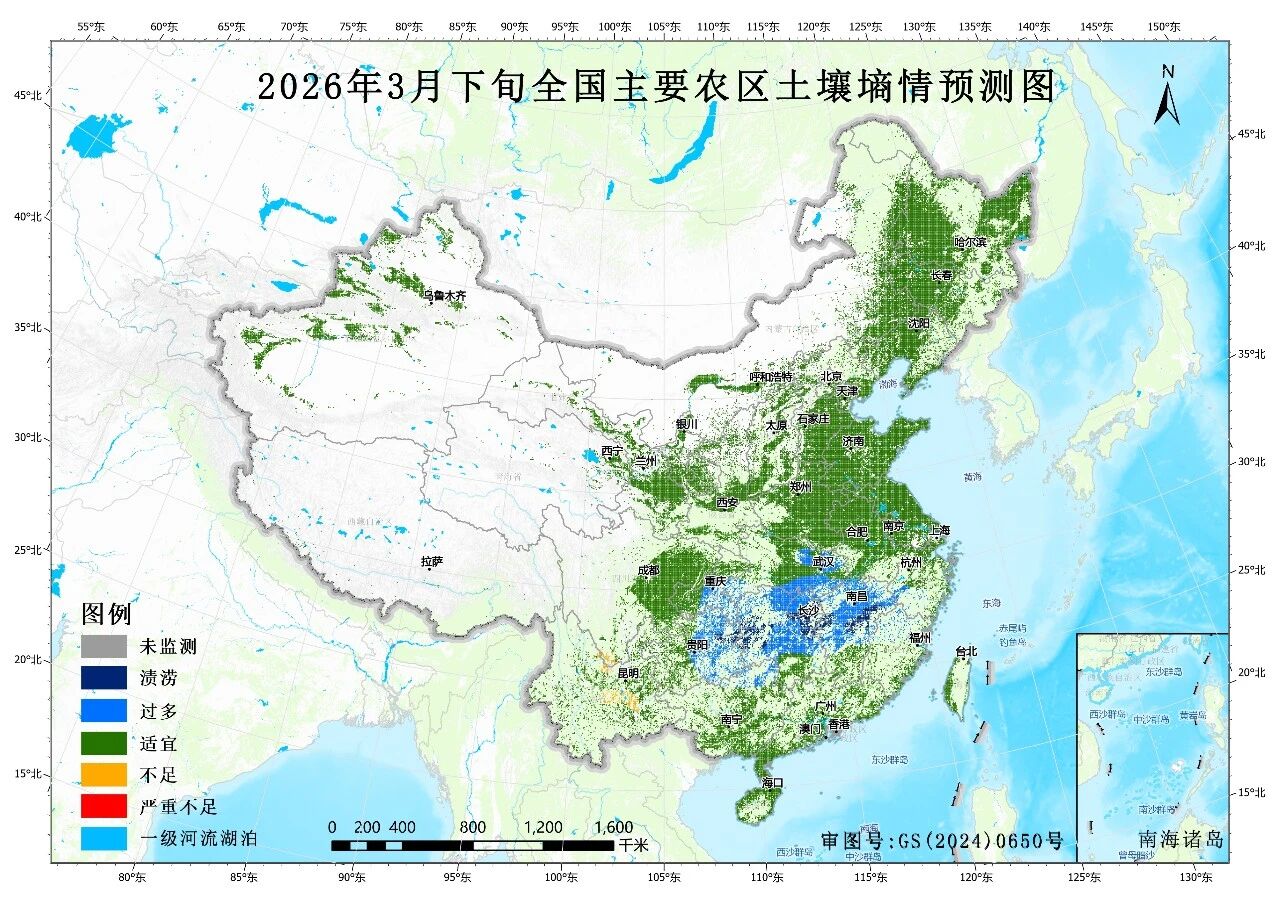 据3月19日全国土壤墒情监测与专家会商,目前全国主要农区大部墒情适宜,山东胶东局地、云南中北部、贵州西部、甘肃陇中、新疆东疆局部墒情不足,湖北中南部、江西西北部、湖南北部局地墒情过多。据中央气象台预测,3月下旬江汉南部、江淮西南部、江南及贵州、广西西北部降水量较常年同期偏多3—7成,其余地区降水偏少。预计3月下旬大部农区墒情适宜,云南中北部局地墒情不足,江淮南部、江汉局地墒情过多