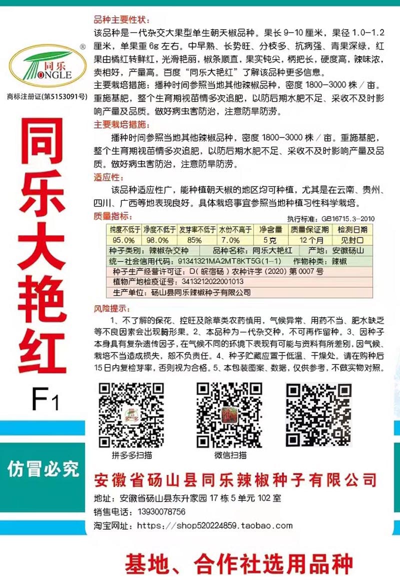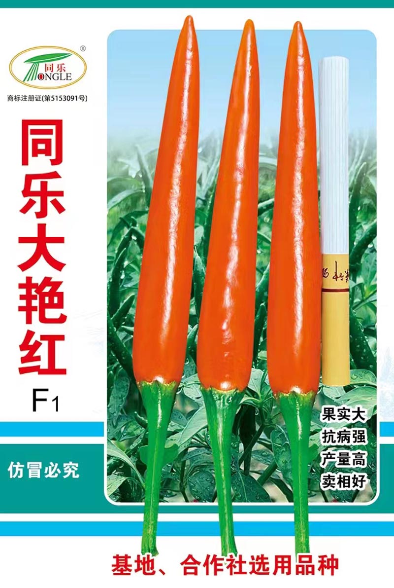 同乐大艳红是一代杂交大果型单生朝天椒品种。果长9-10厘米,果径1.0-1.2厘米,单果重6g左右。中早熟、长势旺、分枝多、抗病强、青果深绿,红果由橘红转鲜红,光滑艳丽,椒条顺直,果实钝尖,柄把长,硬度高,辣味浓,卖相好,产量高。百度“同乐大艳红”了解该品种更多信息。
