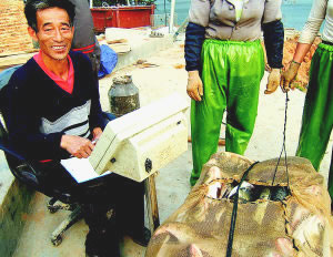 吕梅顺老人正在为捕上来的鱼过秤。 对于“洗脚上岸”后的生活,他感觉很满足。