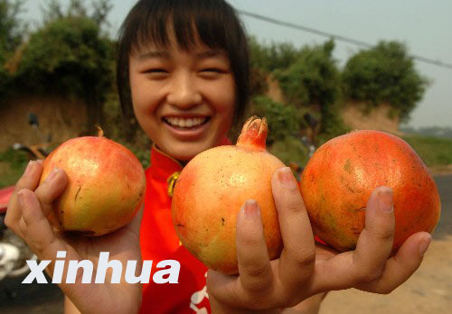 9月9日上午,在河南省荥阳市举办的“河阴石榴节”上,一名工作人员在展示手中三只准备参加评比的优质石榴。位于黄河南岸的荥阳市,栽种石榴已有2100多年历史,目前全市的石榴栽种面积超过了2万亩,品种有20多个,年产石榴300万公斤,石榴已经成为全市沿黄地区农村的支柱产业。 新华社记者王颂摄