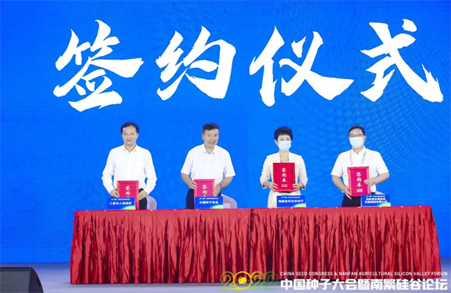 中国种子协会会长张延秋、海南省农业农村厅厅长何琼妹、三亚市人民政府市长陈希、海南省农垦投资控股集团有限公司董事长包洪文作为代表共同进行“中国种子大会暨南繁硅谷论坛合作框架协议”签约。