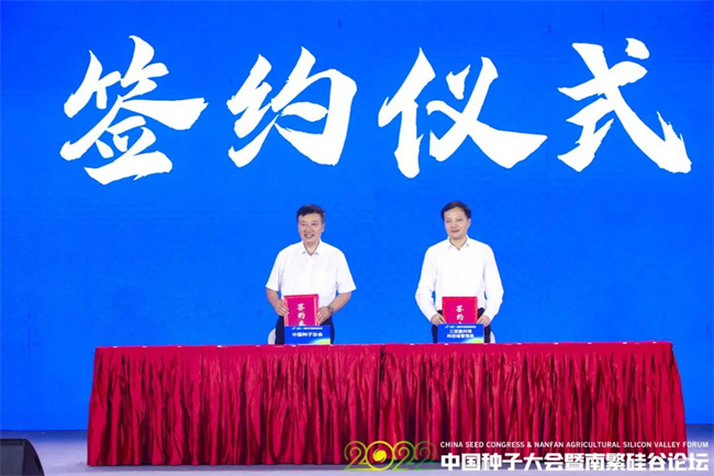 中国种子协会会长张延秋、三亚崖州湾科技城管理局局长陈希作为代表签署中国种子协会与三亚崖州湾科技城管理局“合作备忘录”。