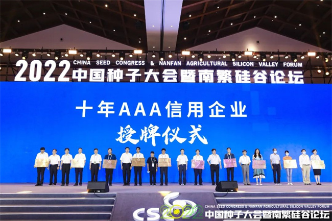 原农业部常务副部长刘成果、国务院国资委监事会原主席崔世安、原农业部党组成员毕美家、原农业部总农艺师孙中华、中国种子协会会长张延秋、中国蔬菜协会会长杨雄年、中国种子协会顾问陶承光、王兆斌、张文军、张坚勇为“十年AAA”信用企业、2021年AAA级信用企业代表颁发牌匾。
