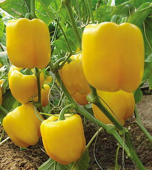 进口杂交一代高档黄色甜椒品种,植株生长中等,抗性强,正常栽培条件下,果实方形且均匀,平均果长9厘米左右,宽9厘米左右,平均单果重250克左右,果肉厚,货架期长,耐运输,成熟时由绿色转亮黄。