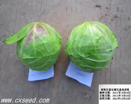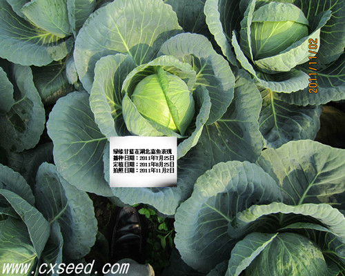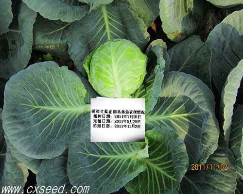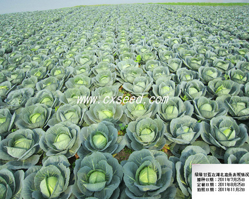 产品介绍:本品种由欧洲进口的一个小圆球的品种,定植后70天收获,单球重1.2公斤左右,外叶开展度小,叶球正圆像皮球,绿叶层厚,品质极佳,属南北市场商品甘蓝的顶级品种。特耐裂球,冬季成熟后两个月不裂球,耐寒性极强,特耐运输,高抗病!!长江流域秋种7月底至8月中播种最佳,亩栽苗5000株。春种2月份播种6月中收获,亩栽苗4000株。