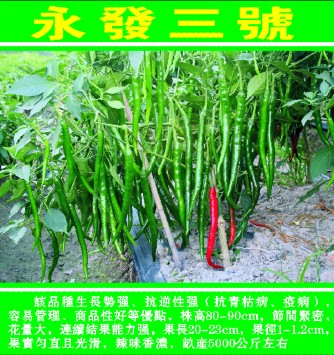 简介:该品种母本引自泰国,具有生长势强、抗逆性强(抗青枯病、疫病),容易管理、商品性好等优点,株高80-90cm,节间紧密,花量大,连续结果能力强,果长20-22cm,果径1-1.2cm,果实匀直且光滑,辣味香浓,亩产