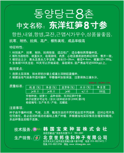简介:特 性:1.抗寒、抗热性好,适应性广,适合春秋栽培。2.生长速度快,抗病性强、耐抽苔,岐根,裂根极少。3.根形为圆柱形、颜色鲜红、收尾早,成品率高。4.根长22-25㎝,根径4
