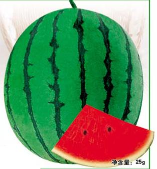 简介:早熟,易座果,开花至成熟需28天左右,果实圆球形,瓜皮底色翠绿,上覆深绿色锯齿形条带14-17条,果实成熟时,果面有明显的蜡粉,单瓜重6-8公斤,最大可达10公斤以上;皮薄抗裂,大红瓤,中心含糖高达1