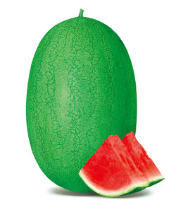 简介:中熟,成熟期32天,果皮绿色,较新红宝表现为果皮光亮,艳丽,条纹清爽美观。颜色深绿,果型周正,商品性好。大果,椭圆型,果肉大红,纤维少,风味特佳,汁多味美,折光糖含量13度以上。果皮坚韧,耐运输,皮