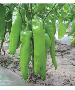简介:1、杂交一代大牛角,2、果实浅绿色,果长 25-33厘米左右,单果130-200克左右,3、果实顺直光滑 ,肉厚耐运,4、连续座果能力强,抗病性突出,丰产性 明显。