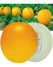 简介: 厚肉甜瓜新品种,植株长势强健,抗病性强,耐低温弱光,全年均可栽培。果实圆形,表面光洁,呈艳丽深金黄色,果肉蜜白,肉厚腔小,具有哈蜜瓜和西洋瓜口感,极耐贮运,适于用作