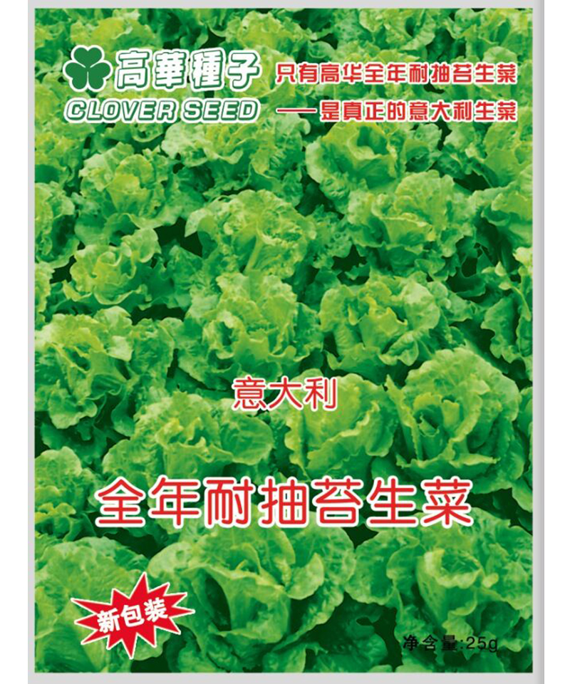 简介: 品种主要性状: 高华意大利全年耐抽苔生菜,植株半包心,菜型美观,整齐度高,爽脆味香,食用品质佳,商品性高。本品种生育期短,生长适应性广,亦较为耐热、耐寒及耐抽苔,全年栽培均可。即使在炎热的