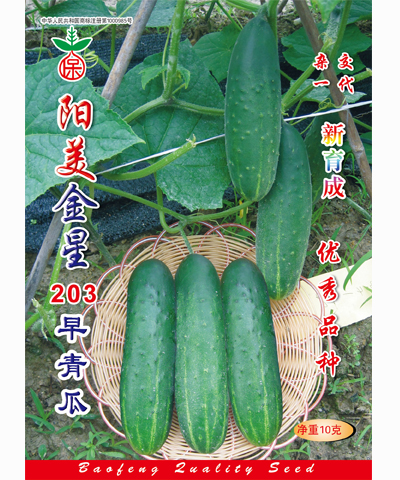 简介:植株长势旺盛,主要4—6节着生雌花,侧蔓第一节开雌花.定植后38天可开始采收;瓜皮平滑,油绿色带金条纹,瓜长22厘米左右,直径约6重米,结瓜能力强,瓜型美观,商品性好,单瓜重500克左右,肉厚