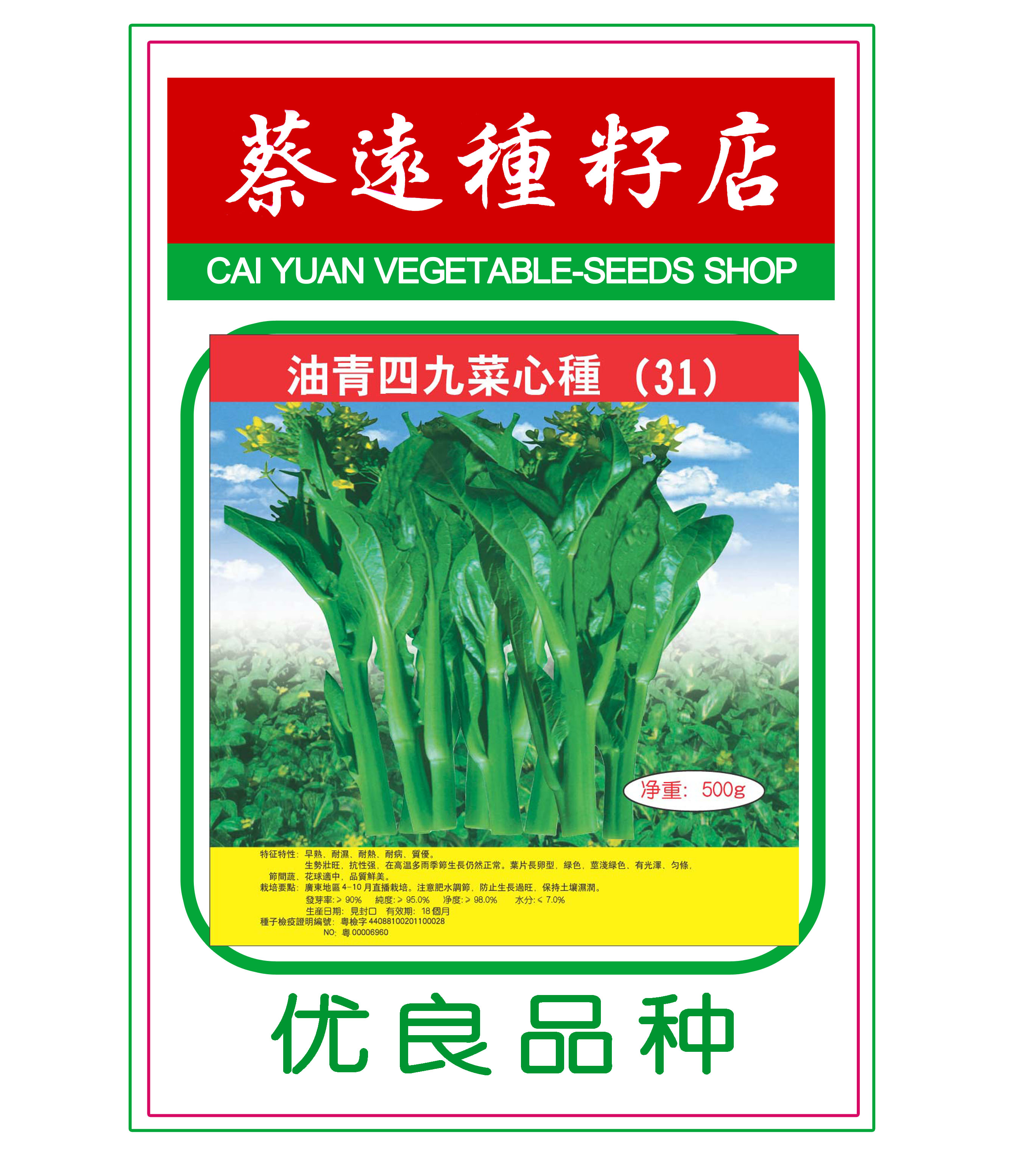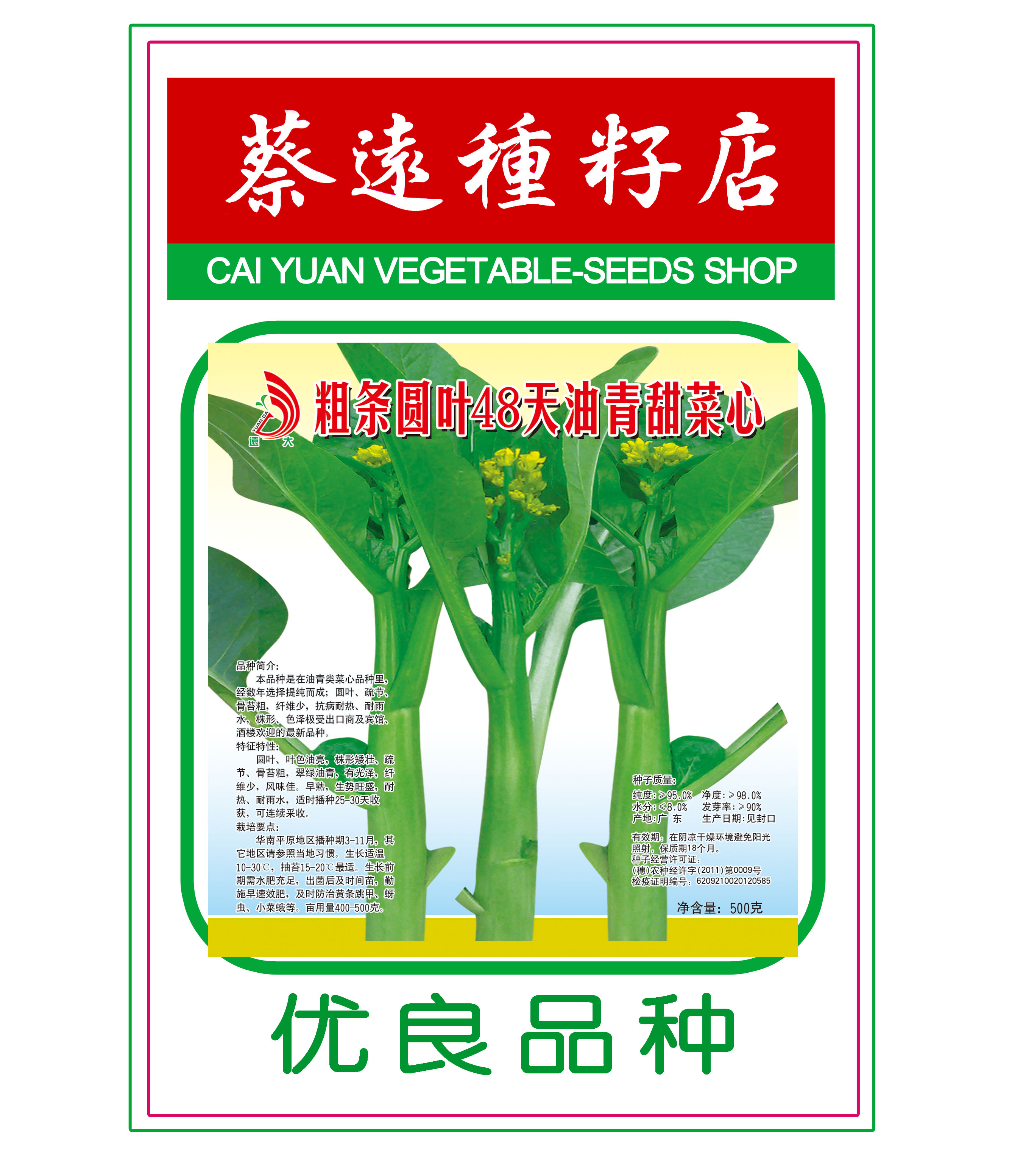 简介:品种简介: 本品种是在油青类菜心品种里,经数年选择提纯而成;圆叶、疏节、骨苔粗,纤维少,抗病耐热、耐雨水,株形、色泽极受出口商及宾馆、酒楼欢迎的最新品种。特征特性: 圆叶、叶色油亮,株形矮壮
