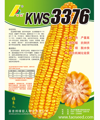 简介:特征特性:中早熟品种,德国KWS公司选育,生育期102-116天左右。株型紧凑清秀,株高250厘米左右,穗位90厘米左右,穗轴红色,马齿,商品性好,千粒重350克,出籽率90%,籽粒灌浆快,成熟后期脱水快,苞叶