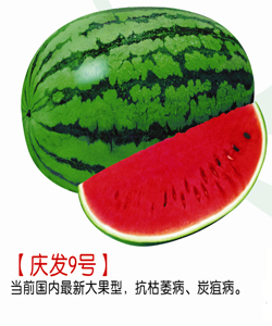 简介: 该品种抗枯萎病、抗炭疽病。枝繁叶茂,生长势强健,花皮、红瓤、少籽,中心含糖13度。标准单瓜重15公斤左右(全国最大瓜王“庆发九号”重168斤&ldq