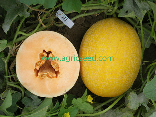 简介:中熟中型哈密瓜品种,全生育期85天,坐果至成熟38天。短椭圆果,黄皮,密布中粗网纹,单果重2.5-3.0公斤。桔红肉,剖面均匀。中心含糖量17%左右,肉质酥脆,口感好,品质优。易坐果。抗病性较好,生态适应
