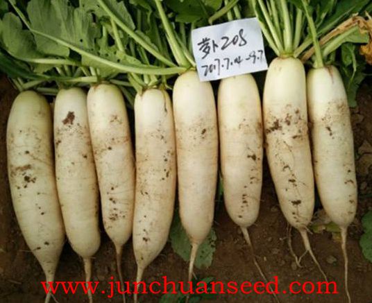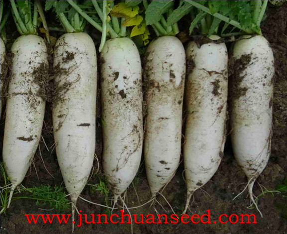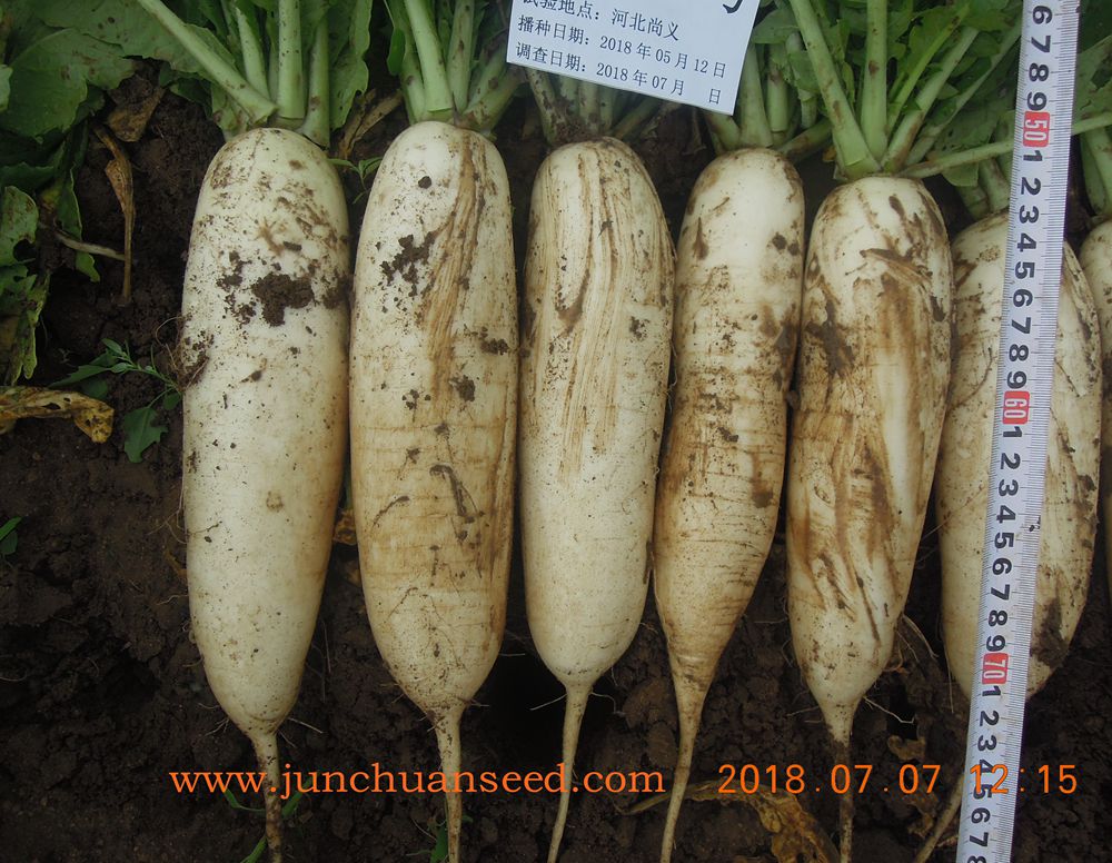 简介: 根部白,略带青肩,根形近圆柱形,曲根、裂根少,整齐度好,收尾钝圆。叶丛半直立,可适度密植,产量高,种植后55天左右可采收,根长27cm左右,根径7cm左右,单根重1.3kg左右。适合早春保护地、晚春地栽培